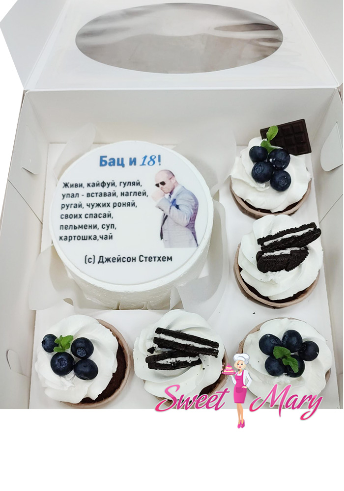 Представляем вам изысканный набор бенто “Печенька” – идеальный подарок для вашего любимого мужчины! В центре композиции – нежнейший торт, украшенный творческим мастерством кондитеров, который подарит ему незабываемые вкусовые ощущения. Вместе с тортом идут пять миниатюрных капкейков, каждый из которых создан с любовью и наполнен неповторимым вкусом. Этот набор станет ярким выражением ваших чувств и вниманием к мелочам, делая любой день особенным. Идеально подходит для поздравления с праздником или просто для того, чтобы сделать его утро сладким и приятным!