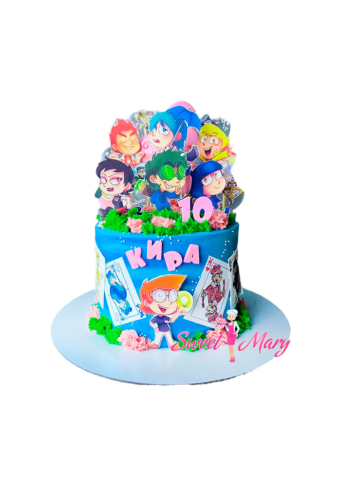 Торт “Казино ночь” — это уникальное кулинарное произведение, выполненное в ярком синем цвете, которое мгновенно перенесет вас в мир приключений мультфильма “13 Карт”. На поверхности торта красуются персонажи из любимого анимационного сериала, окруженные игрой света и тени, словно в самом разгаре захватывающего казино-ночного действа. В центре композиции выделяется цифра 10, символизирующая удачу и азарт, а также карты, выполненные с потрясающей детализацией, добавляющие праздничную атмосферу и делая этот торт идеальным выбором для тематических вечеринок и дней рождения.