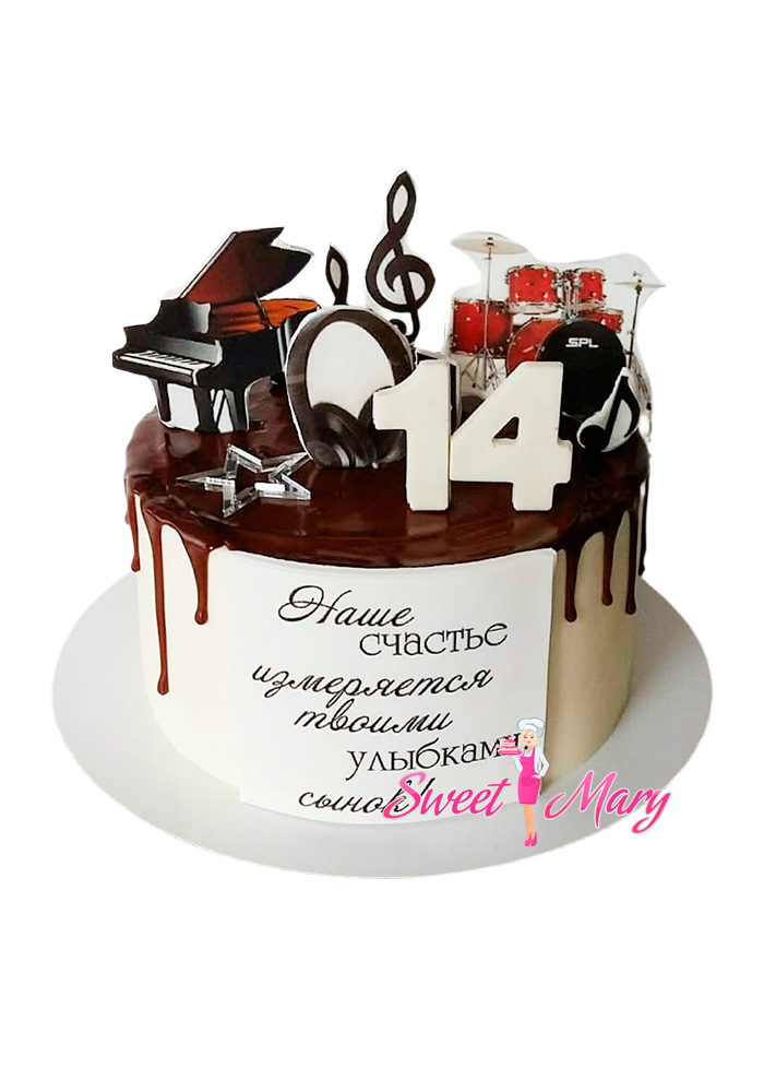 Торт “Барабан «Бит и сладость»” — это уникальное кулинарное произведение искусства, созданное специально для юбиляра, достигшего 14-летия! Белоснежная основу торта украшает роскошное покрытие из глянцевого шоколада, подчеркивая его изысканность и праздничность. Центральное место занимает стилизованное изображение барабана, выполненное из кондитерских элементов, окруженное изящными нотами, словно музыка наполняет воздух вокруг. На торте также присутствуют миниатюры музыкальных инструментов — пианино и наушники, которые гармонично дополняют тему праздника, делая его особенно запоминающимся для меломанов и музыкантов. Этот торт станет настоящим центром внимания на дне рождения, подарив радость и вдохновение как юному музыканту, так и его друзьям!