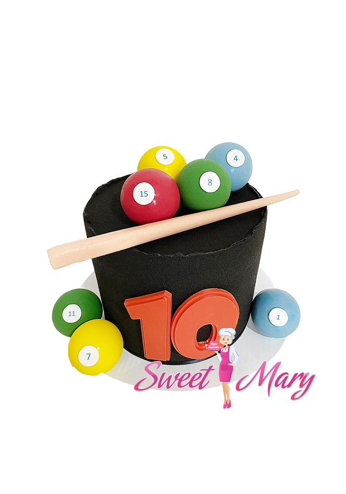 Торт “Бильярдный азарт” — это уникальное кулинарное произведение, созданное специально для мальчишек, увлекающихся бильярдом! Он поражает своим дизайном: полностью черный фон украшен яркими бильярдными шариками, а центральный акцент — огромный кий с эффектно выделенными цифрами “10”. Этот торт станет настоящим центром внимания на дне рождения, подчеркивая страсть юного именинника к игре и добавляя праздничному столу атмосферу настоящего спортивного праздника.