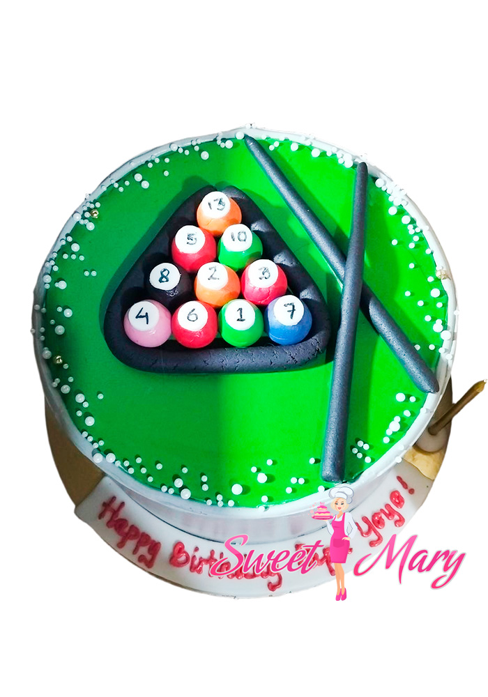 Торт “Бильярд «Легкий шар»” — это уникальное кулинарное произведение, созданное специально для настоящих ценителей бильярда и стильных вечеринок! Этот праздничный десерт поражает своей оригинальностью: его основу составляет нежный зеленый крем, символизирующий зеленую сукноватую поверхность стола, а сверху аккуратно размещены фигурки из кондитерского теста, напоминающие настоящие шары для бильярда. Идеально подходит для дня рождения мужчины, любящего игры и элегантность, этот торт станет настоящим центром внимания, подчеркивая индивидуальность именинника и наполняя атмосферу праздника неповторимым шармом.