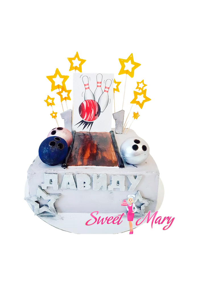 Торт “Strike Cake” — это уникальное кулинарное произведение, созданное специально для маленького спортсмена! Этот торт серого цвета, украшенного элементами боулинга, станет настоящим центром внимания на празднике первого дня рождения мальчика. На поверхности торта изящно размещены разноцветные шары, словно готовые к броску, а также миниатюрные гантели и яркие звезды, символизирующие удачу и успехи. Это не просто десерт, а настоящий подарок для юного любителя спорта, который запомнится надолго.