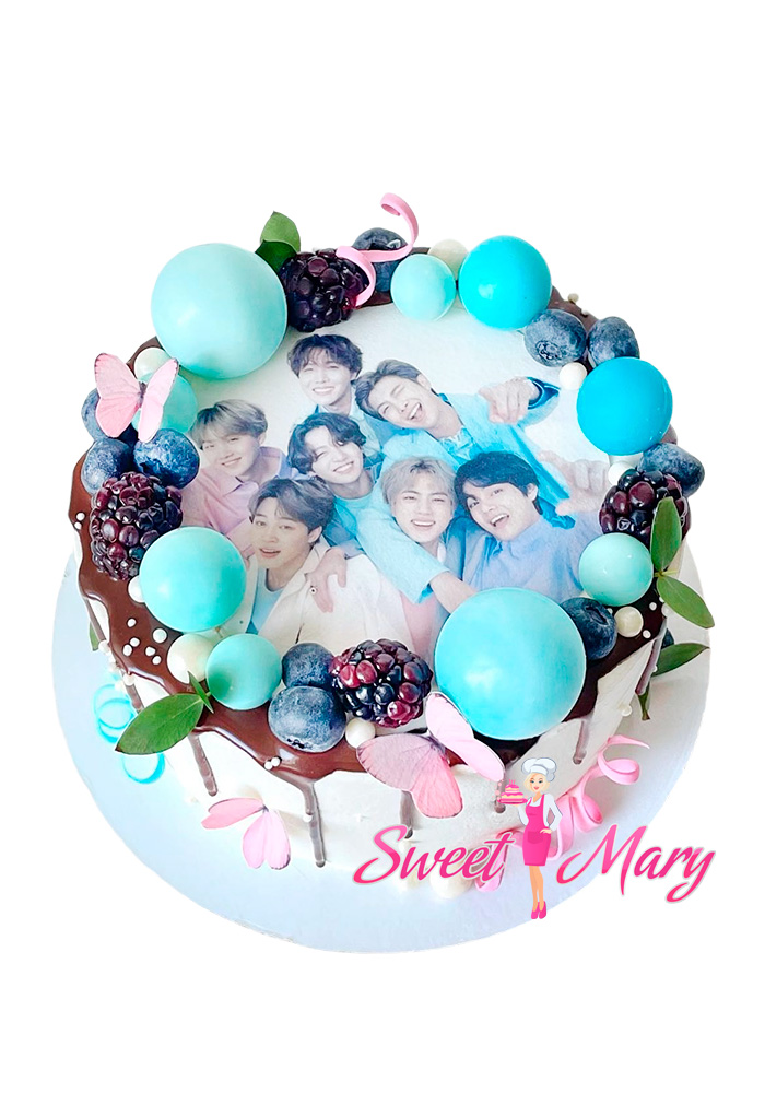 Торт БТС «Глазурь и Ритмы» — это кулинарное произведение искусства, созданное специально для поклонников легендарной группы. Нежно-голубой фон торта украшает яркие образы любимых исполнителей, выполненные из сахарной глазури, которые словно оживают на поверхности. Этот десерт украшен изящным слоем темного шоколада, который добавляет нотки изысканности и роскоши. В центре композиции — свежие ягоды, создающие живительный контраст вкуса и ароматный акцент, а также декорированные бабочки, добавляющие неповторимую воздушность и праздничность. Каждый кусочек этого торта наполнен музыкой и вдохновением, делая его идеальным выбором для фанатов и любителей сладкого.
