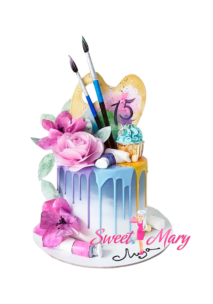 Торт «Мастерство и яркость» — это настоящий шедевр для любого любителя искусства! Его нежный фиолетовый фон напоминает об изысканности и утонченности творчества, а центр композиции украшен миниатюрами из сахара: изящные цветы символизируют красоту природы, мольберт с кисточками олицетворяют творческий процесс, а акварельные разводы придают изделию неповторимую глубину. Особое внимание привлекает цифра 75, выполненная в виде изящного декора, которая может отмечать юбилей или знаменательную дату в жизни художника. Этот торт не просто угощение, а произведение искусства, способное вдохновить и порадовать настоящего мастера кисти.
