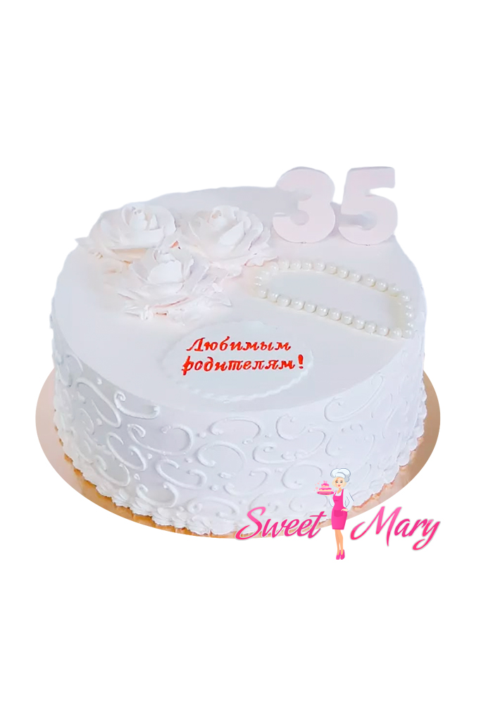 Торт “Мамина забота” – это изысканное поздравление, созданное с любовью для самых близких людей. Этот белоснежный шедевр украшен аккуратными цифрами “35”, символизирующими знаменательную дату, а также нежными розочками и изящными бусами, которые придают торту особую женственность и утонченность. Сочный крем и нежное тесто делают его не только роскошным украшением стола, но и настоящим гастрономическим наслаждением, способным выразить самые теплые чувства к маме и папе.