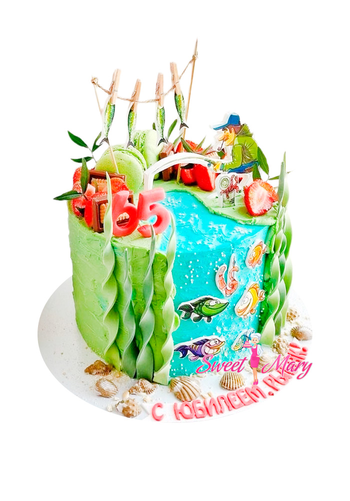 Торт “На берегу” — это кулинарное произведение искусства, созданное специально для настоящего рыбака! В центре композиции — красочный персонаж рыбака, выполненный из сахарной глазури, окружённый мельчайшими деталями, такими как удочка и рыбацкая лодка. Особая деталь торта — цифра “65”, символизирующая счастливый год рождения или количество лет увлечению рыбалкой, вылепленная с любовью и мастерством. На вершине торта гордо возвышается фигурка рыбки, словно пойманная прямо из чистых вод, что добавляет праздничному десерту неповторимый вкус удачи и удачи на воде. Идеальный подарок для любого ценителя рыбалки и сладкого!