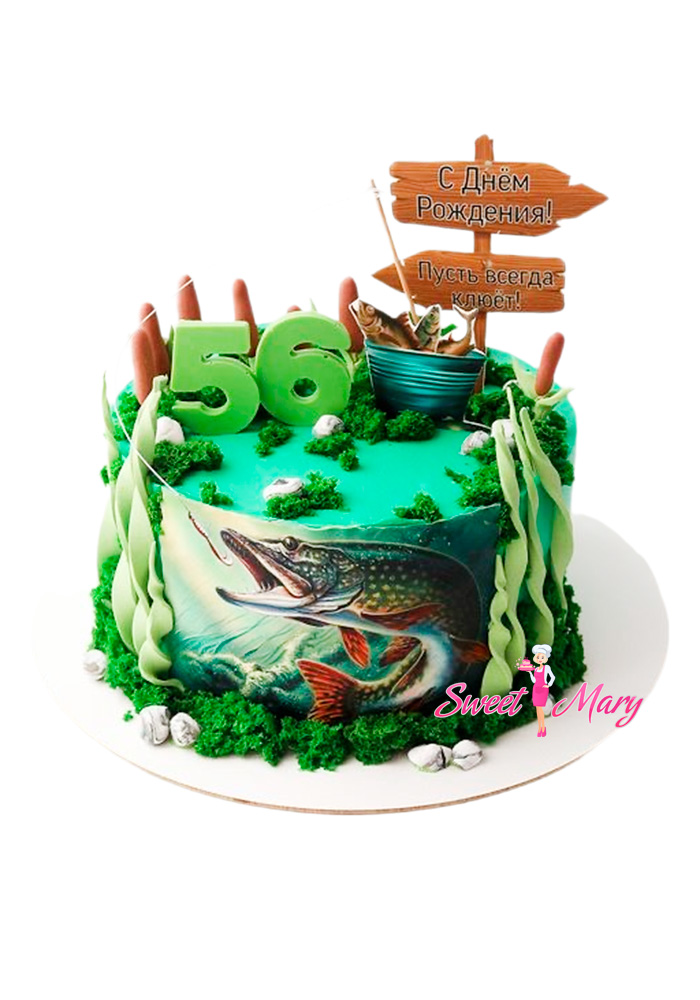 Торт “На рыбалке” — это уникальное кулинарное произведение, созданное специально для настоящих любителей природы и активного отдыха! Сочный зелёный фон торта символизирует свежесть утреннего леса и спокойную водную гладь озера. В центре композиции — красочный карась, искусно вылепленный из крема, словно только что пойманный упрямец. Рядом расположился забавный фигурный рыбак, выполненный в ярких тонах, который оживляет праздничное настроение. Этот торт идеально подходит к празднованию знаменательной даты — 56-летия, наполнив торжество атмосферой удачи и приятных воспоминаний о рыбалках. Каждое его украшение исполнено любви и внимания к деталям, делая этот десерт настоящим произведением искусства, которое точно не оставит равнодушным ни одного настоящего рыболова!