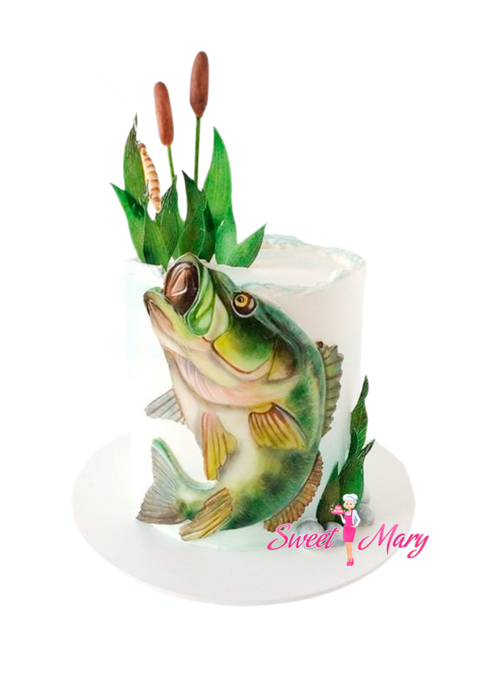 Торт «Рыбная симфония» — это кулинарное произведение искусства, созданное специально для настоящих ценителей рыбной охоты. Его элегантный белый фон напоминает спокойную поверхность водоема, а центральная деталь — реалистично выполненный из кондитерской массы карась — олицетворяет удачу и богатый улов. По краям торта изящно располагаются фигурки из марципана в виде камышей, добавляя нотку природы и создавая атмосферу тихого рыболовного утра. Этот торт станет изысканным украшением любого торжества, посвященного рыбалке, или подарком, который точно придется по вкусу настоящему любителю воды и снасти.