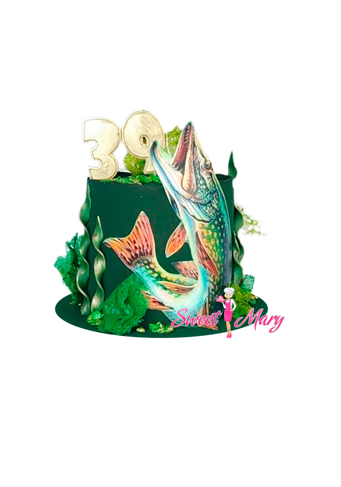 Торт «Рыбный улов» — это кулинарное произведение искусства, созданное специально для настоящего рыболова! Этот восхитительный торт зеленого цвета напоминает свежесть воды и зелень берегов, где любят отдыхать любители рыбной ловли. В центре композиции гордо возвышается огромная щука, выполненная из кондитерских элементов, что добавляет торту неповторимый шарм и узнаваемость. На поверхности торта аккуратно выгравированы цифры 39, символизирующие рекордный улов или просто любимое число нашего героя-рыбака. Это уникальное десертное творение станет главным украшением любого праздничного стола, будь то день рождения или корпоратив среди единомышленников. Пусть каждый кусок этого торта приносит радость и воспоминания о незабываемых приключениях на воде!