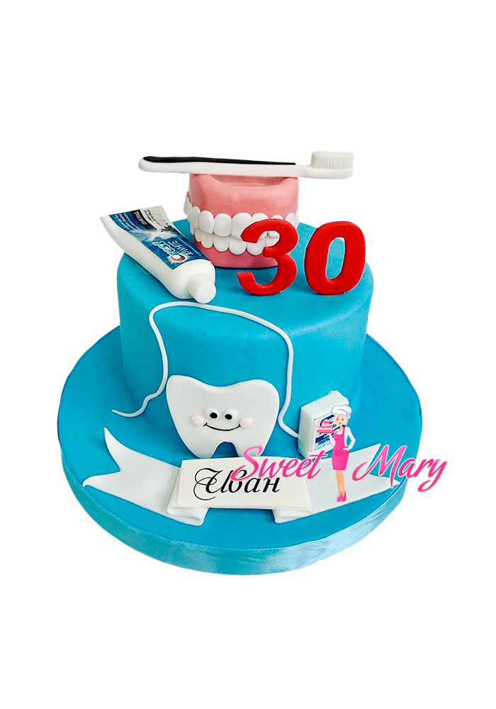 Торт “Зубной фейерверк” — это уникальное кулинарное произведение, созданное специально для праздничного дня вашего зубного врача! В центре внимания — элегантный торт голубого цвета, символизирующий свежесть и профессионализм. На его поверхности изящно выложены цифры “30”, подчеркивая юбилей или значительный жизненный этап. Особенностью торта являются яркие элементы, напоминающие зубы, аккуратно расположенные вокруг белоснежной челюсти, которая служит основой композиции, создавая эффект настоящего фейерверка улыбок. Это не просто десерт, а настоящий подарок, который точно поднимет настроение и добавит праздничного настроения в день торжества!