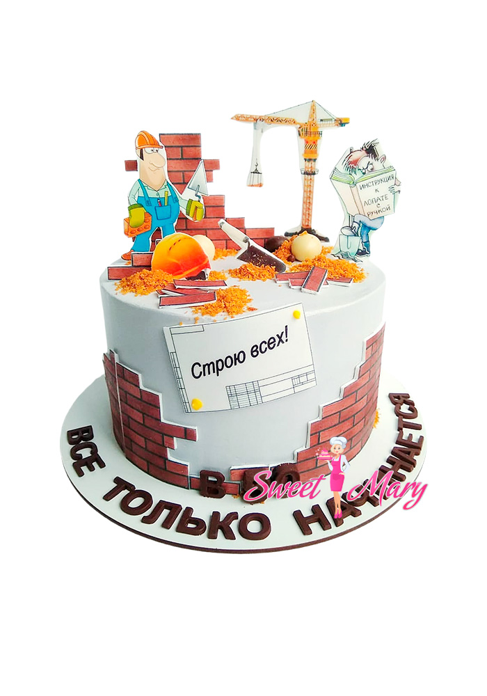 Торт “Строительная мечта” — это уникальное кулинарное произведение, созданное специально для настоящих мастеров своего дела! Его изысканная внешность поражает сразу: торт выполнен в натуральных оттенках серого, напоминая аккуратную кирпичную кладку. На поверхности торта красуются фигурки стройного рабочего в полной атрибутике — каске, перчатках и спецовке, что делает этот десерт настоящим символом профессии. Под слоем крема скрываются нежные слои шоколадного бисквита, а внутри — начинка из сливок с нотками кофе, которая идеально сочетается с темой. Этот торт станет ярким центром любого корпоративного праздника или личного торжества строителей, подчеркнув уважение к их труду и профессионализму.