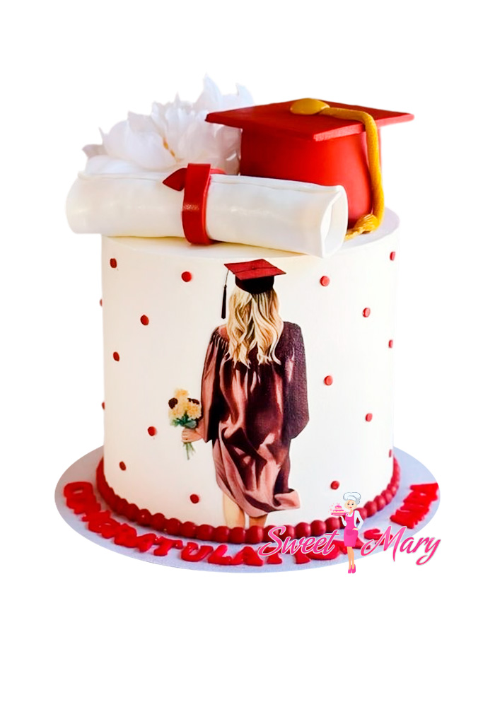 Торт “Вкус победы” — символизирующий торжество интеллектуальных достижений и начало нового этапа жизни! Этот изысканный десерт, выполненный в белом цвете, украшен живой фигурой выпускницы, которая гордо держит в руках свиток диплома и красную шапку победителя. Каждая деталь торта выполнена с любовью и вниманием к деталям, создавая атмосферу праздника и успеха. Идеально подходит для поздравления выпускников и студентов, стремящихся к новым вершинам знания и мастерства.