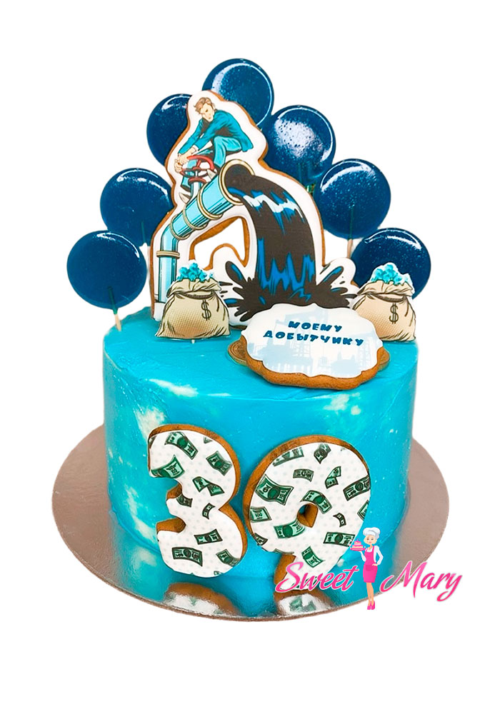 Торт «Добыча на высоте» — это уникальное кулинарное произведение, созданное специально для настоящих профессионалов нефтегазовой отрасли. Его элегантный дизайн выполнен в доминирующем голубом цвете, символизируя бескрайние горизонты и глубину знаний. В центре торта гордо возвышаются цифры “39”, напоминая о достижении значимых результатов и годовом юбилее компании. На торте изящно разбросаны леденцы на палочке, словно бурильные установки, подчеркивающие праздничную атмосферу. Главный акцент — фигурка нефтяной трубы, выполненная из кондитерского теста, которая добавляет торту не только визуальную привлекательность, но и глубокий смысл, отражая профессионализм и инженерные достижения нефтяников. Это идеальный подарок для корпоративного праздника или личного торжества!
