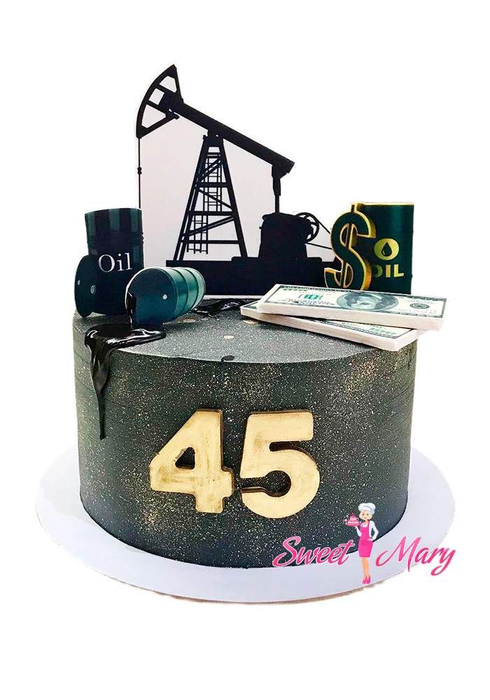 Торт “Геологический успех” — это изысканное кулинарное произведение, созданное специально для настоящих профессионалов нефтегазовой отрасли. Его темный шоколадный фон олицетворяет глубину недр, а золотые цифры “45” символизируют 45-летний опыт успеха в индустрии. На торте выделяется изящный силуэт станка-качалки, выполненный из эфемерных кондитерских элементов, окруженный символикой процветания: золотыми долларами и бочками с нефтью. Этот торт станет не только роскошным украшением любого корпоративного праздника или юбилея, но и уникальным подарком, полным уважения к профессиональным достижениям нефтяников.