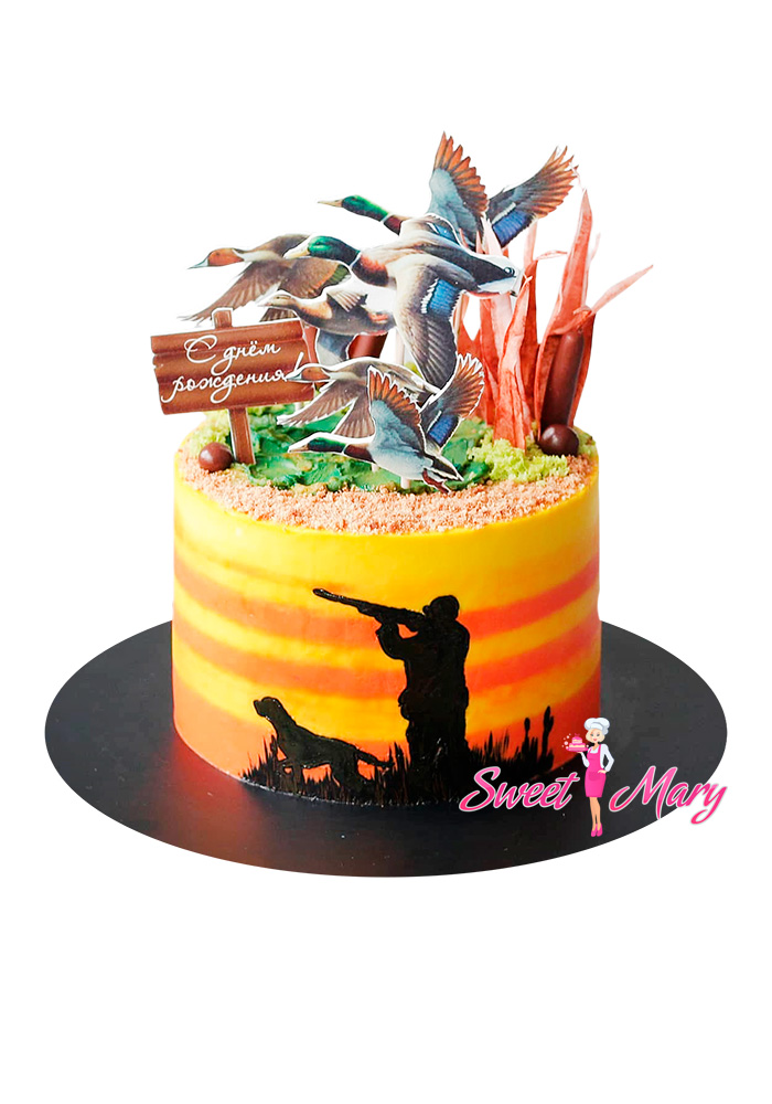 Торт “Лесная страсть” — это настоящий шедевр для ценителей природы и охоты! Оранжевый фон торта создает эффект яркого осеннего леса, а в центре композиции — очаровательный охотник в традиционной форме, окруженный стайкой уток. Это не просто десерт, а произведение искусства, которое подарит незабываемые впечатления от каждого кусочка. Идеально подходит для любителей активного отдыха и праздничного настроения!