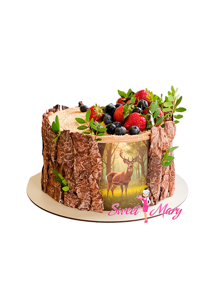 Торт “Лесной мастер” — это кулинарное произведение искусства, которое перенесёт вас в сердце дремучего леса. В центре композиции — пышный лесной пень, мастерски выполненный из нежнейшего шоколадного теста, украшенного натуральными элементами коры. На вершине торта гордо стоит фигурка благородного оленя, словно охраняя свои владения. Ягодные акценты, собранные из свежих малины, земляники и голубики, придают изделию неповторимую свежесть и природную изысканность, делая его настоящим лакомством для настоящего охотника и ценителя природы.