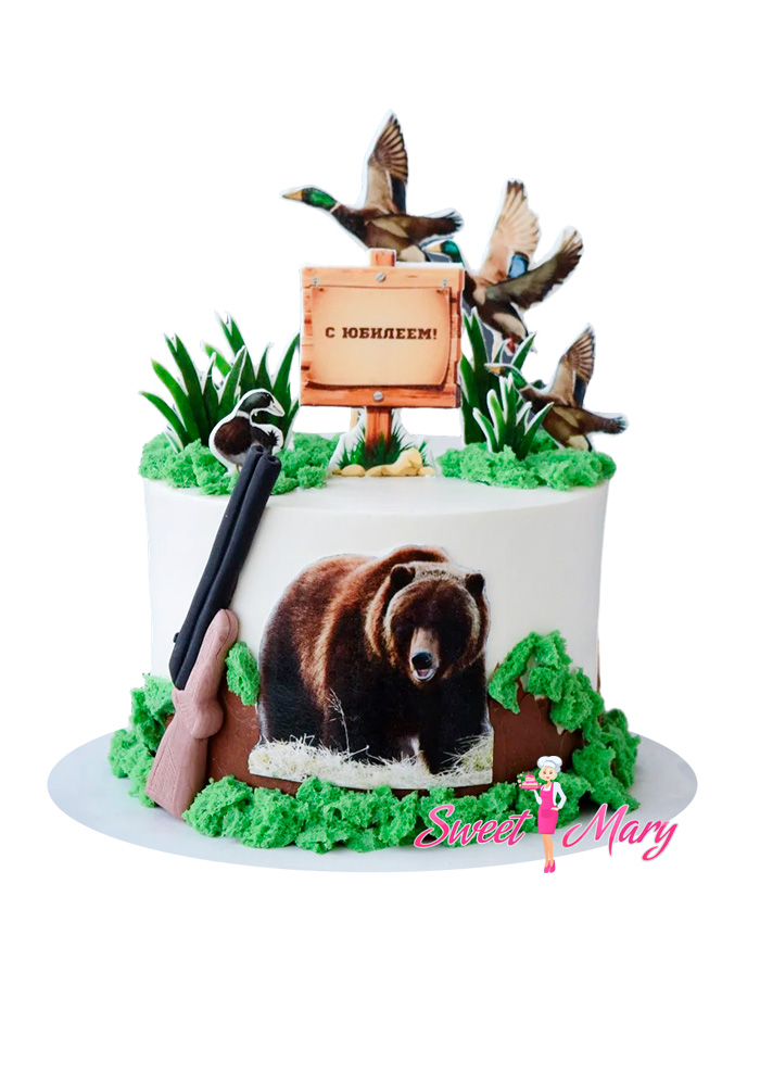 Торт «Медвежий трофей» — это изысканное кулинарное произведение, созданное специально для настоящего охотника. Его белоснежная поверхность украшена изящной скульптурой медведя, держащего в лапах старинное ружье, окруженного стайкой уток. В центре торта располагается элегантная надпись “С Юбилеем!”, выполненная из сахарных элементов, что добавляет торжественности и личного поздравления к этому уникальному десерту. Этот торт станет не просто угощением, а настоящим произведением искусства, способным удивить и восхитить любого ценителя природы и праздника.