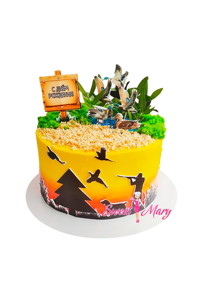 Торт “Охотничий мастер” — это уникальное кулинарное произведение, созданное для истинных ценителей природы и охоты. Его ярко-оранжевая глянцевая поверхность словно рассвет над водной гладью, а изящные фигурки из крема: камыши, плавающие утки и опытный охотник с ружьем, погружают в атмосферу тихой охоты на рассвете. Каждый элемент торта выполнен с любовью к деталям, создавая неповторимую композицию, которая станет настоящим украшением праздничного стола и подарит незабываемые впечатления как гостям, так и самому охотнику по духу.