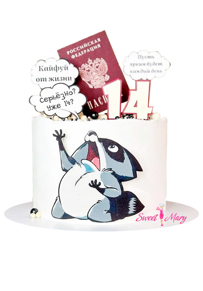 Торт “14 лет приключений” — это незабываемый подарок к дню рождения юного героя! Этот белоснежный шедевр украшен огромными цифрами “14”, выполненными из крема, которые символизируют вступление в новую фазу жизни, полную увлекательных открытий. В центре композиции гордо восседает огромный енот, воплощение весёлого духа приключений, готовый к новым подвигам вместе с юным гостем праздника. Шуточные надписи по всему торту добавляют игривость и уникальность: от “Чтобы каждый день был приключением!” до “Герой, который всегда готов к приключениям!”. Такой торт не только порадует именинника, но и станет главным украшением стола, вызывая улыбки и смех гостей. Идеально подходит для мальчишников, где каждый момент наполнен радостью и весельем!