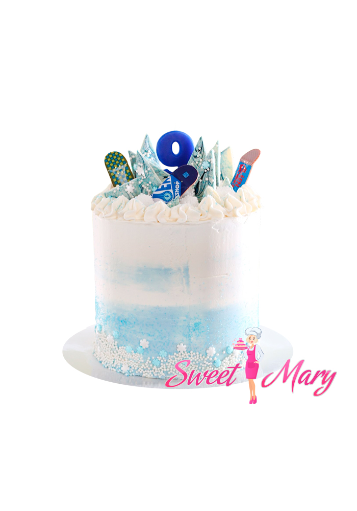 Торт “Ледяной вызов” — это изысканное кулинарное произведение, созданное специально для настоящих любителей снежных трасс и захватывающих спусков. Его белоснежная поверхность украшена изящными силуэтами сноубордов, символизируя динамичное движение по заснеженным склонам. Особое внимание привлекает цифра 9, выполненная из сахарной глазури, которая может олицетворять уровень мастерства или значимый опыт горнолыжника. Этот торт не только восхитителен на вид, но и наполнен нежным кремом с нотками свежести, напоминающими о горных вершинах. Идеальное угощение для праздничного стола любого снежного энтузиаста!