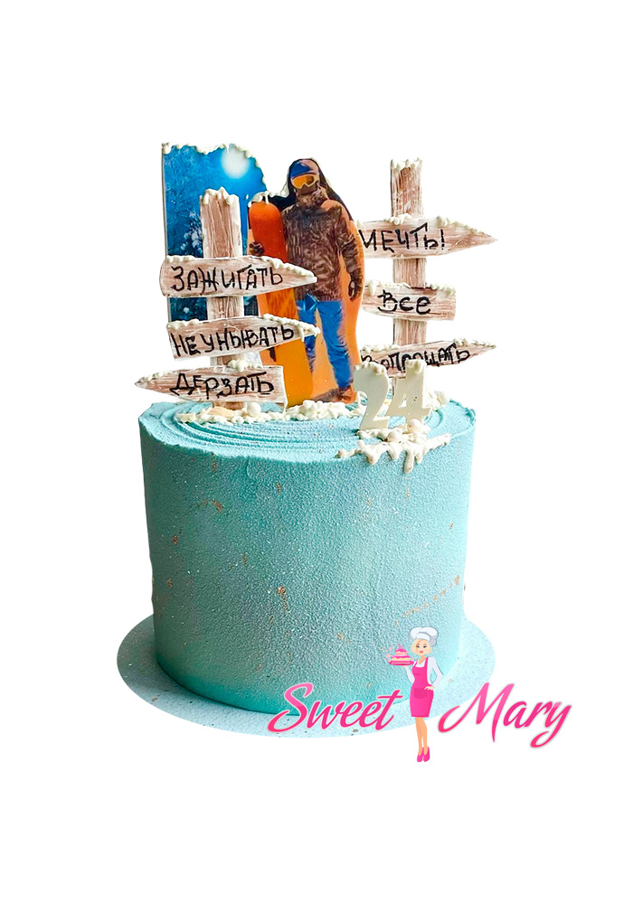 Торт “Снежный спуск” — это уникальное кулинарное произведение, созданное специально для настоящих любителей зимних приключений! Этот торт поражает своим изысканным дизайном: его основу составляет нежная глазурь голубого цвета, символизирующая чистейший снежный покров горных склонов. В центре композиции гордо изображен фигурный сноубордист, готовый к захватывающему спуску, что добавляет торту динамичности и неповторимой атмосферы зимнего спорта. На торте четко выписаны цифры “24”, подчеркивая актуальность момента или годовщину важного события, делая этот десерт идеальным подарком для любого праздника. Торт “Снежный спуск” — это не просто вкусное лакомство, а настоящее произведение искусства, которое восхитит даже самого искушенного гурмана.