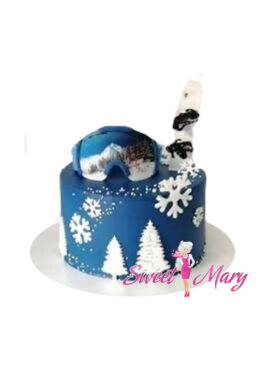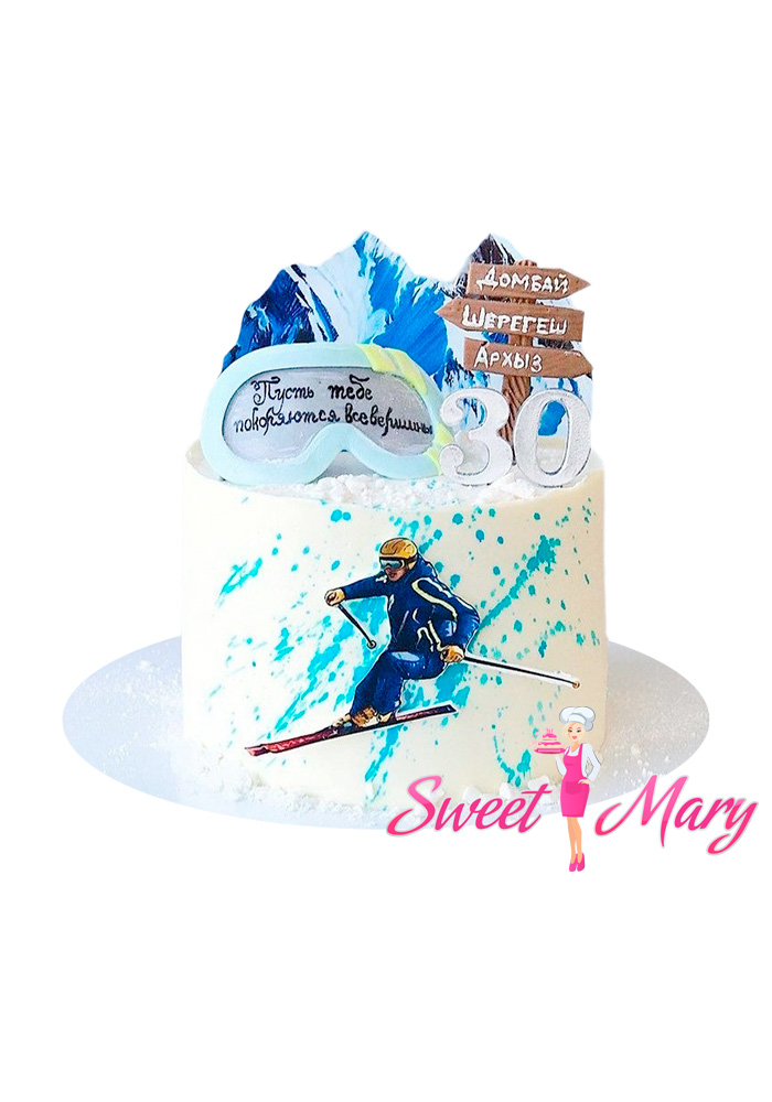 Торт “Снежный вызов” — это настоящий ледяной шедевр для настоящего сноубордиста! Белоснежное основание торта украшено изысканными мазками голубого цвета, символизирующих горные склоны и чистый снежный покров. На торте четко прорисованы величественные горы, а в центре — динамичный образ сноубордиста, мчащегося вниз по заснеженной трассе, в стильных очках и с поднятым вверх флагом с цифрой “30”, отсылающей к годовому юбилею или знаменательному достижению. Это произведение кондитерского искусства не только восхитительно выглядит, но и радует вкусовые рецепторы нежным кремом и сочными ягодами, делая его идеальным подарком для любого любителя зимних экстремальных видов спорта.