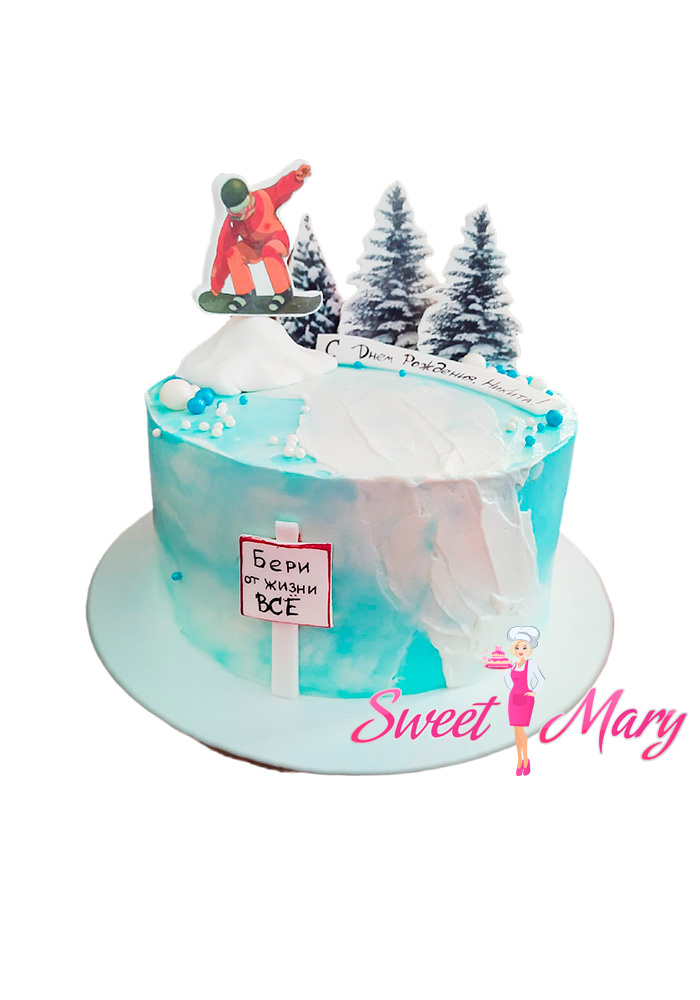 Торт «Взлет на снегу» — это настоящий праздник для любого сноубордиста! В изысканной голубой гамме торт украшен фигуркой смельчака, несущегося по заснеженным склонам на своем сноуборде. На фоне праздничных елок сияет вдохновляющая надпись: “Бери от жизни все”, которая добавляет торту атмосферу веселья и драйва. Этот шедевр кондитерского искусства станет незабываемым подарком на день рождения или корпоративную вечеринку, поднимая настроение и вызывая улыбку на лицах гостей.