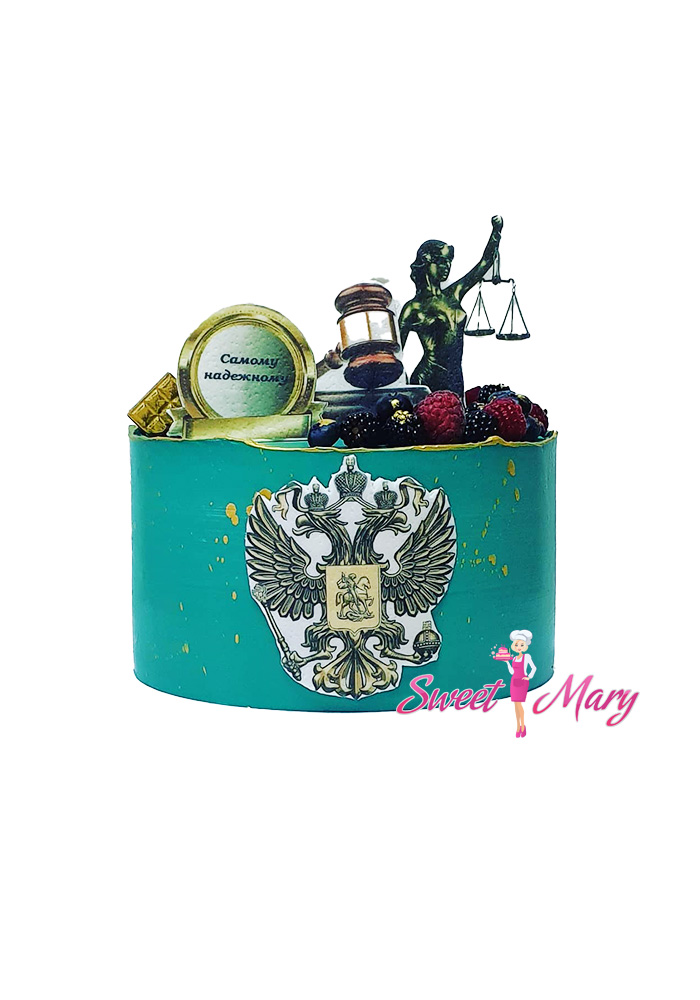 Представляем уникальный торт “Правосудие и вкус” — кулинарное произведение искусства, созданное специально для ценителей справедливости и изысканного вкуса! Этот торт изумительного зеленого цвета украшен скульптурным изображением богини Фемиды, символизирующей правосудие, держащей в руке весы и сверкающий золотой молоток. На фоне российского герба, тонко вылепленного из сахарной глазури, он выглядит особенно величественно. Внимание к деталям дополняется свежими ягодами, которые придают торту нотки сочности и натуральности, делая его не просто десертом, но настоящим праздником для всех чувств. Идеально подходит для торжественных мероприятий, юбилеев или просто как знак уважения и благодарности уважаемому судье. Гармоничное сочетание формы и вкуса делает этот торт настоящим произведением кулинарного искусства, которое не оставит равнодушными ни одного гостя.