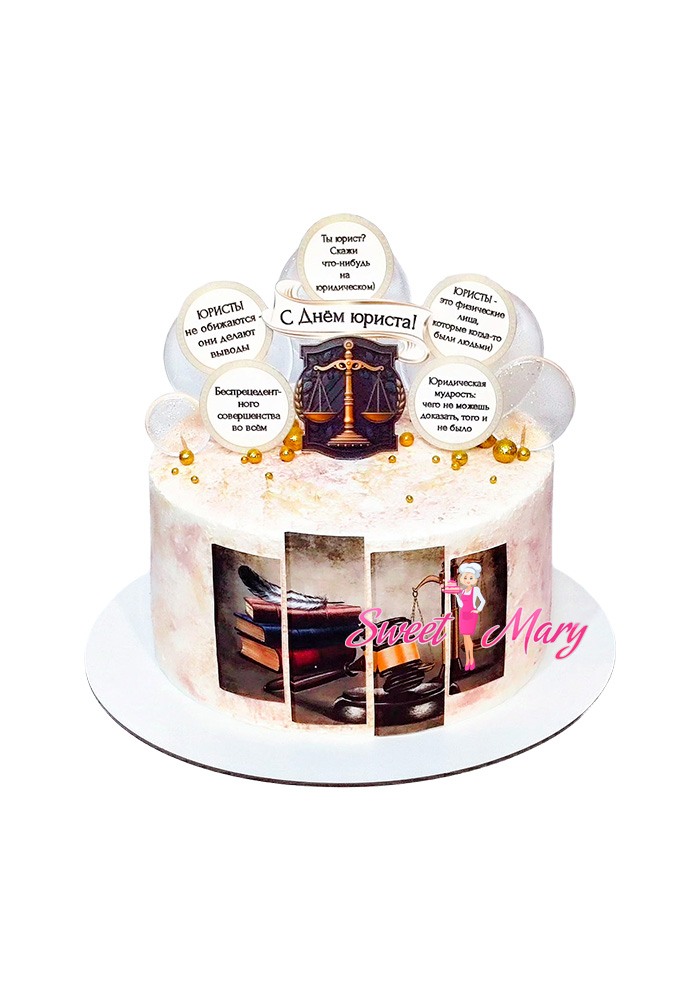 Торт “Судья с балансом” — это изысканное кондитерское произведение, созданное специально для праздничного стола юриста. Его белоснежная поверхность украшена миниатюрными фигурками весов и аккуратно расположенными книгами, символизирующими мудрость и справедливость. Этот торт станет идеальным подарком к “Дню юриста”, подчеркивая профессионализм и интеллект его владельца. Богатый кремовый вкус сочетается с нежной текстурой, делая этот десерт настоящим произведением искусства для ценителей утонченного вкуса.