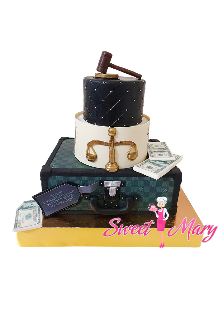 Представляем вам уникальный кулинарный шедевр — торт “Взвешенный десерт”! Этот трехъярусный деликатес, выполненный в изысканном черном цвете, станет настоящим украшением любого торжества для ценителей правосудия и стиля. Его нижний ярус стилизован под элегантный кожаный чемодан, символизирующий профессиональную сферу деятельности. На торте эффектно размещены золотые весы, тонко намекая на баланс справедливости, а рядом — пачки долларов, подчеркивающие значимость и престиж профессии. Завершает композицию фигурка молота, гордо возвышающаяся на вершине торта, что делает этот десерт поистине уникальным подарком для суда или судебного работника. Откройте мир вкуса и символики с тортом “Взвешенный десерт”!