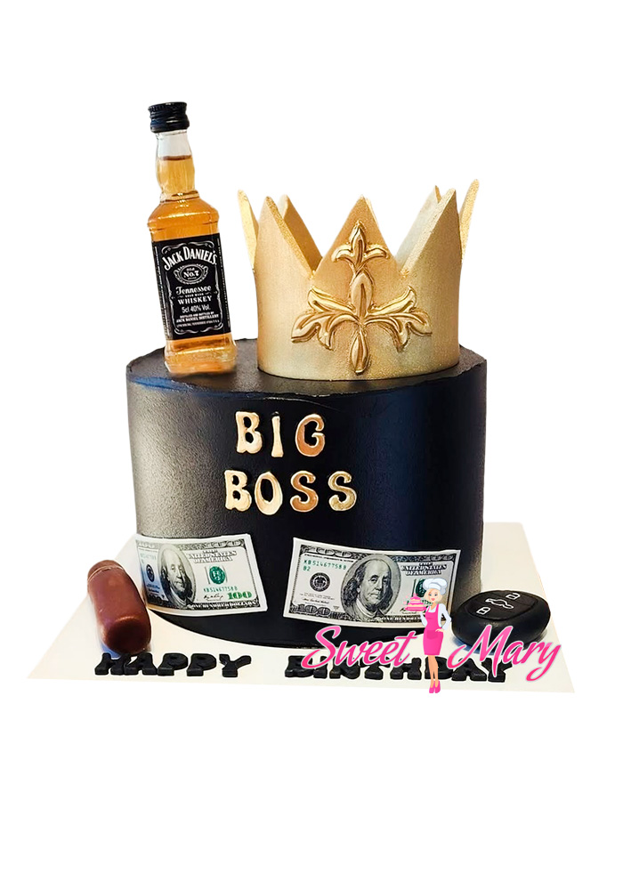 Представляем вам уникальный подарок — торт “Бутылка-сюрприз”! Этот изысканный десерт выполнен в виде элегантной бутылки темного цвета, украшенной золотой короной, что придает ему статусность и величие. Идеально подходит для поздравления начальника или важного бизнес-партнера. Внутри торта скрывается сюрприз: настоящая бутылка шампанского и россыпь золотых долларов, символизирующих успех и процветание. Это не просто торт, это настоящий знак уважения и признания заслуг!