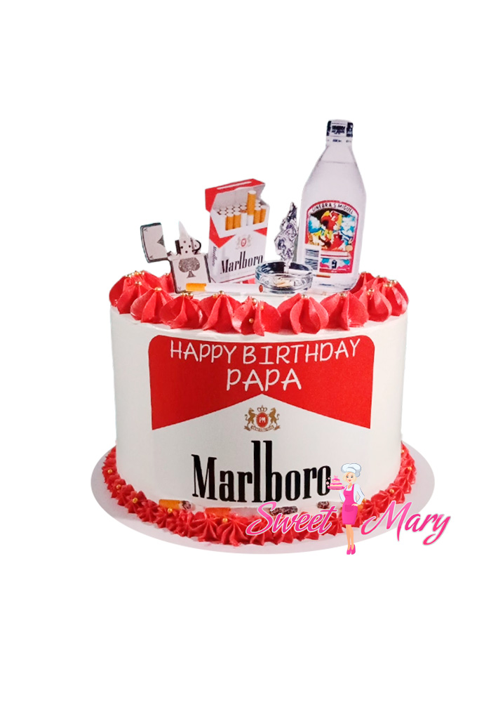 Представляем вам уникальный десерт — торт в виде бутылок “Мальборо”! Этот изысканный торт белого цвета поражает своим реализмом: на нём четко выделяется узнаваемый логотип “Mальборо”, что сразу же вызывает улыбку у ценителей оригинального дизайна. Верхний уровень украшен миниатюрами из шоколада в форме сигарет и изящной зажигалки, создавая эффект присутствия. А внутри этого торта скрывается нежное сочетание крема с нотками виски, добавляющее ему особенного вкуса и атмосферы праздника. Идеально подходит для корпоративов, тематических вечеринок или просто как сюрприз близким друзьям!