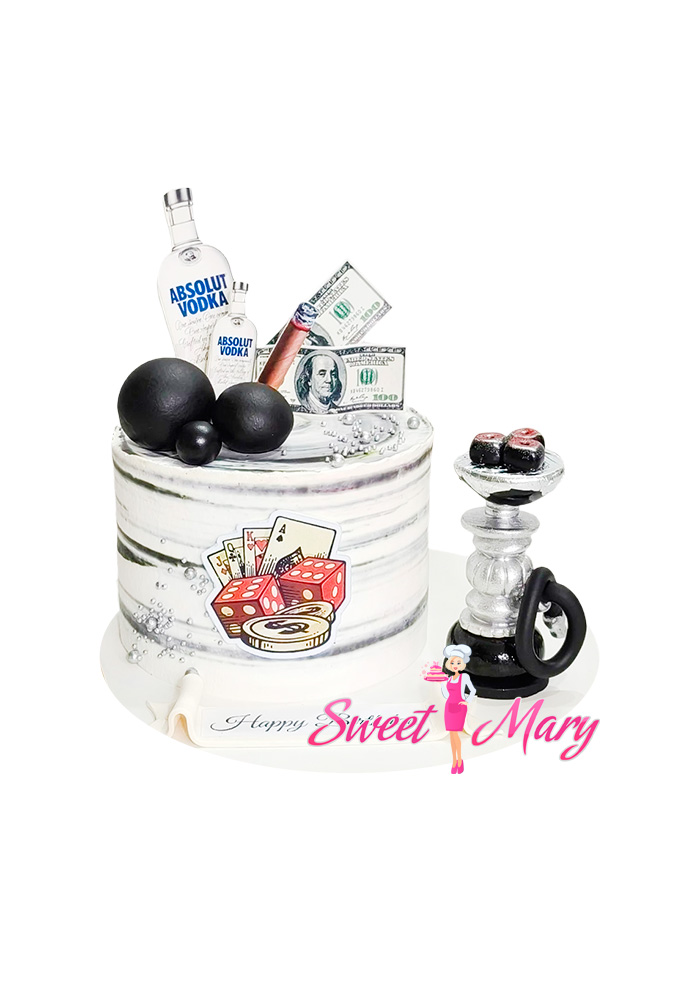 Представляем уникальный торт “Бархат” — изысканное сочетание вкуса и стиля! Этот шедевр кондитерского искусства выполнен в белом цвете, напоминая элегантность и чистоту. В центре торта величественно возвышается бутылка Absolut, окружённая символами роскоши: настоящими одноразовыми долларами, картами покера и роскошной сигарной. Идеальное сочетание сладкого и стильного, “Торт-бархат” станет настоящим украшением любого торжества или корпоративного мероприятия, поражая гостей своей оригинальностью и великолепием.