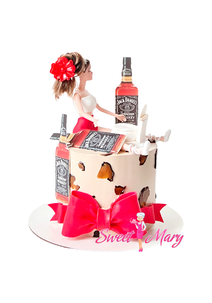 Представляем эксклюзивный торт «Бутылка Джека», который станет настоящим украшением любого торжества! Этот шедевр кондитерского искусства выполнен в виде изысканной бутылки виски Jack Daniel’s, покрытой нежным белым кремом. На шее бутылки изящно закреплен красный бант, добавляющий образу элегантности и праздничного настроения. В центре композиции изображена очаровательная девушка, символизирующая радость и удачу, что делает этот торт не просто десертом, а произведением искусства, готовым удивить гостей своим уникальным дизайном и неповторимым вкусом.