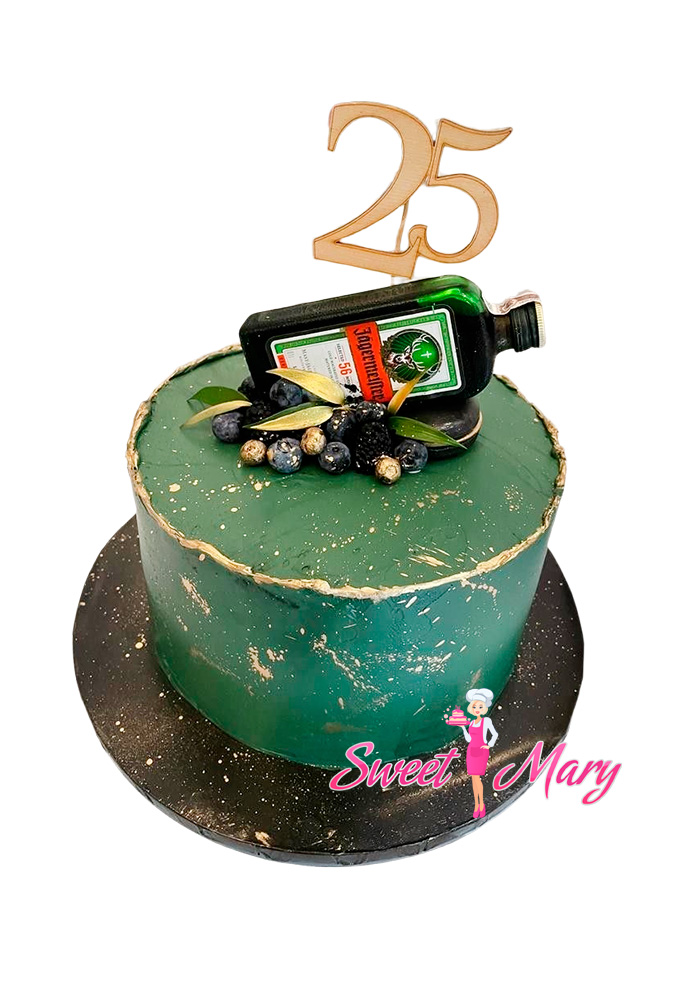 Представляем вам уникальный торт “Винтаж” — произведение кулинарного искусства, вдохновленное классическим дизайном! Этот торт украшен в элегантных оттенках зелёного цвета, напоминая о неповторимой эпохе винтажных бутылок. Его основная особенность — форма, стилизованная под знаменитую бутылку Егерь Мастер, что делает его настоящим украшением любого стола.