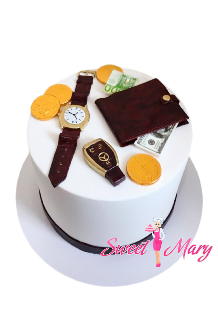 Торт “Пора пирожков” — это уникальное кулинарное произведение, идеально подходящее для торжества по случаю дня рождения мужчины. В центре композиции — реалистичные часы, выполненные из сахарной глазури, которые точно укажут время праздника. Часы украшены золотыми монетами, создающими эффект роскоши и удачи. Рядом с часами расположился стильный кошелек, наполненный аппетитными фигурками, а также часы, напоминающие дизайн от Mercedes-Benz, что добавляет изделию нотки изысканности и стиля. Этот торт не просто десерт, а настоящий арт-объект, способный удивить и восхитить даже самого искушенного ценителя вкусных сюрпризов.