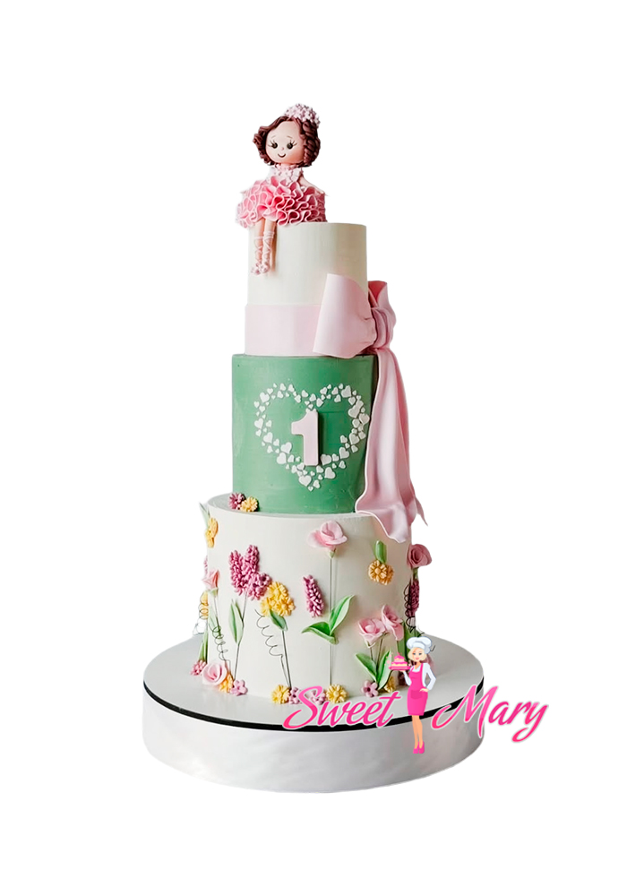 Этот очаровательный трёхъярусный торт “Девочка-карамель” станет настоящим центром внимания на первом дне рождения вашей малышки! Он выполнен в нежных оттенках белого и зелёного, украшены изящными цветочками и крупным бантом, который добавляет образу праздничное настроение. Милый образ девочки на торте не оставит равнодушным ни одного ребёнка, а его вкусовые качества обеспечат незабываемую сладость этого знаменательного события.