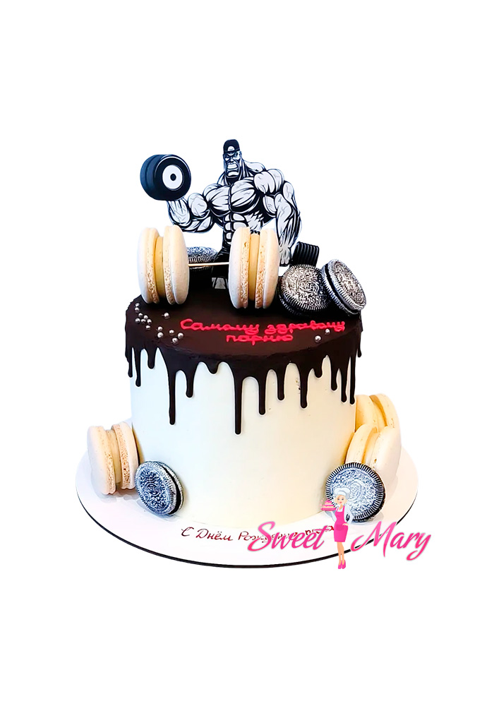 Представляем вам уникальный десерт — торт “Гиря-сладость”! Этот кулинарный шедевр выполнен в форме гири весом 16 кг, что делает его не просто лакомством, но и настоящим украшением стола для любого спортивного праздника или корпоративного мероприятия. Торт белого цвета с нежной кремовой начинкой эффектно облит натуральным темным шоколадом, создавая контраст и подчеркивая его спортивную форму. На торте изображен забавный силуэт спортсмена, поднявшего гирю, что добавляет изделию динамичности и неповторимого шарма. “Гиря-сладость” — это не просто угощение, а символ силы и энергии, который наверняка вызовет восхищение у всех гостей. Идеален для любителей здорового образа жизни и спорта!