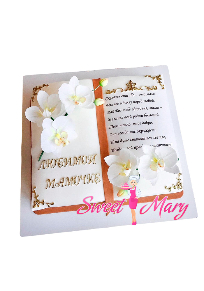 Представляем уникальный десерт — торт в виде книги «Листая мечты», который станет настоящим произведением искусства на праздничном столе! Этот элегантный торт белого цвета идеально подходит для торжественного юбилея любимой женщины. Его обложка выполнена в форме книги, а на корешке изящно выгравирована надпись “Любимой мамочке”, добавляющая личностное обаяние подарку. На страницах этого торта раскинулись нежные сахарные цветы, которые создают атмосферу волшебства и радости. Это не просто десерт — это символ внимания, любви и уважения, который надолго останется в памяти и сердце вашей мамы или бабушки. Порадуйте дорогого человека незабываемым творением, которое будет радовать глаз и вкус до последнего кусочка!