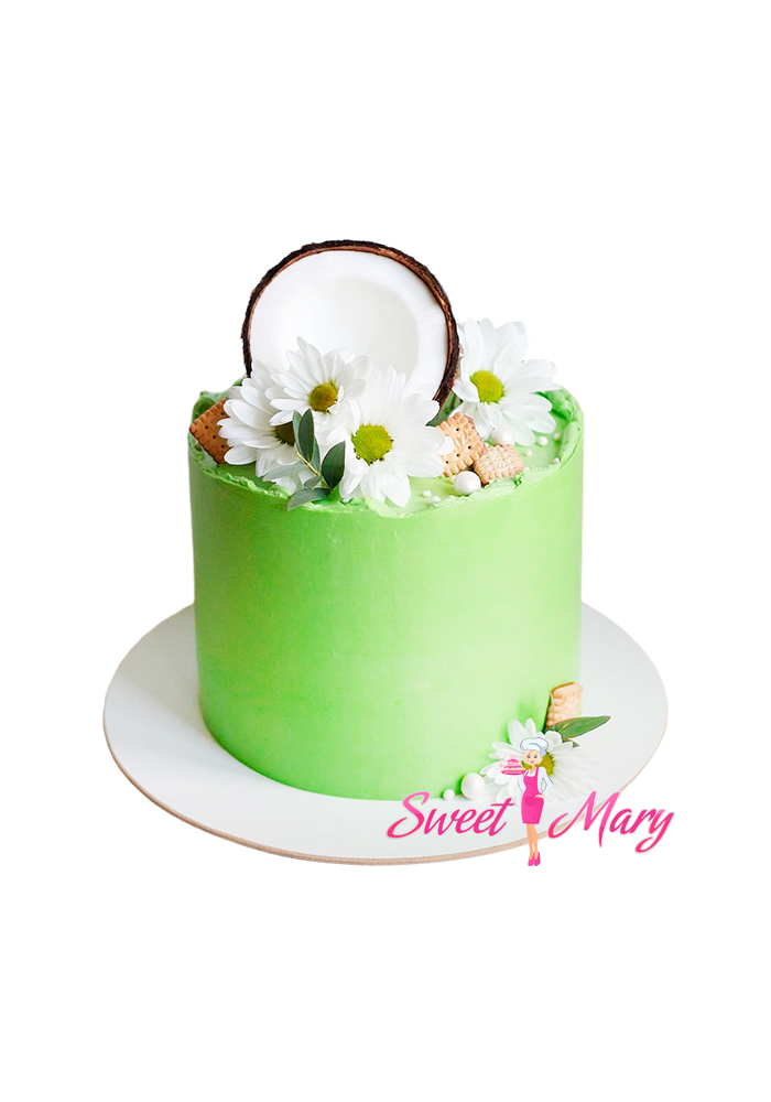 Торт “Кокосовая рапсодия” — это настоящее произведение кондитерского искусства! С первого взгляда он поражает своей изысканностью: нежный салатовый фон украшают изящные ромашки, словно перенесшие нас в летний сад. В центре композиции гордо возвышается фигурка кокоса, выполненная с невероятной точностью, что добавляет торту неповторимую оригинальность и экзотичность. Каждый кусочек этого торта — настоящий праздник вкуса, сочетающий в себе свежесть кокоса и лёгкость крема, создающего ощущение настоящего райского блаженства. Идеально подходит для торжественных случаев и незабываемых вечеров!