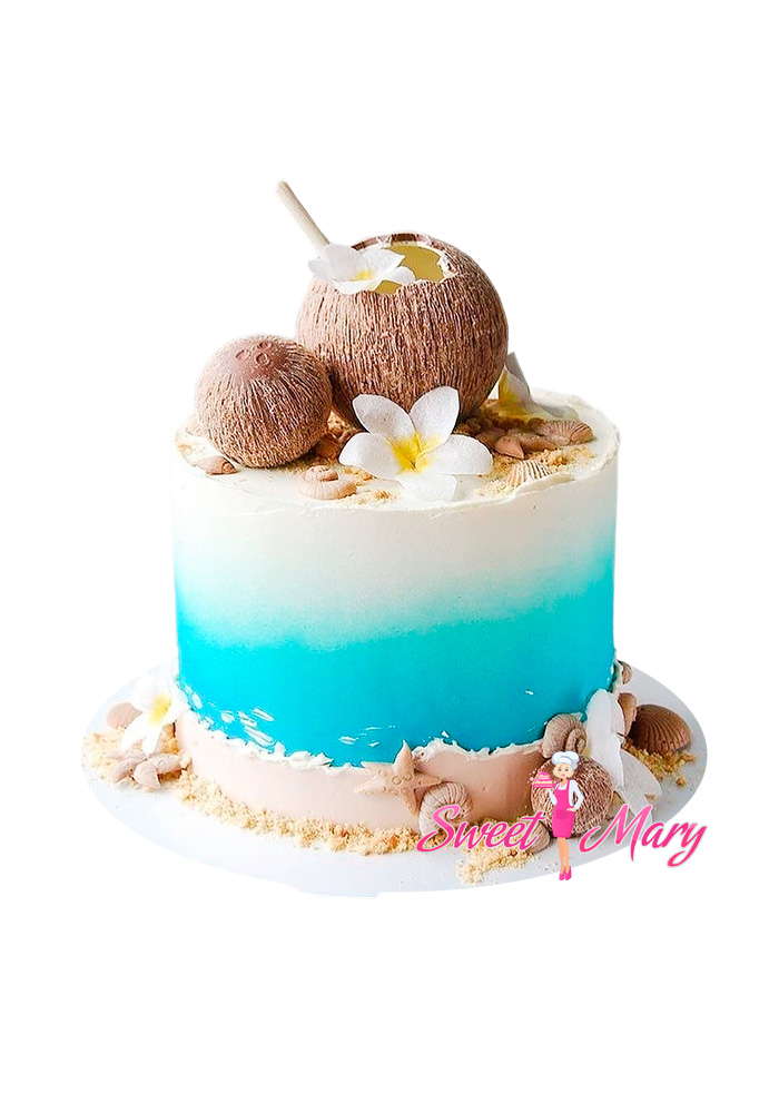 Представляем вам летнее лакомство — торт “Летний бриз”! Этот восхитительный десерт выполнен в форме экзотического кокоса, перенесет вас прямиком на пляж тропической мечты. Его нежная глазурь нежно-голубого оттенка напоминает ласковое море, украшенное настоящими кокосами, изящными цветочками и россыпью ярких ракушек. Каждый кусочек этого торта — настоящий островной рай, который подарит вам ощущение летнего отдыха и беззаботности прямо дома.