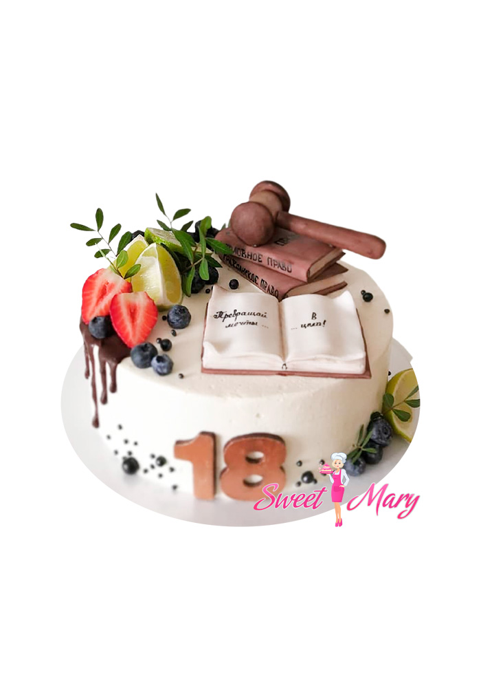 Представляем уникальный торт “Судейский десерт” — изысканное лакомство, созданное специально для юриста! Этот роскошный десерт поражает своим внешним видом: чистый белый фон украшают элегантные цифры “18”, символизирующие годы юридической мудрости, а также стилизованное изображение молотка, олицетворяющее справедливость и профессионализм. Венчает композицию свежая корона из натуральных ягод, добавляющая нотки роскоши и свежести. “Судейский десерт” не просто угощение, это настоящее произведение искусства, которое подастся с честью на любом праздничном столе юриста.